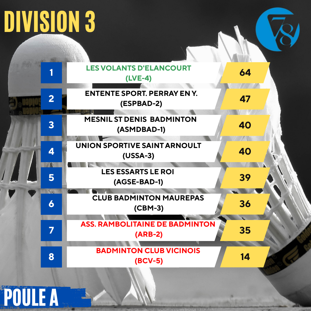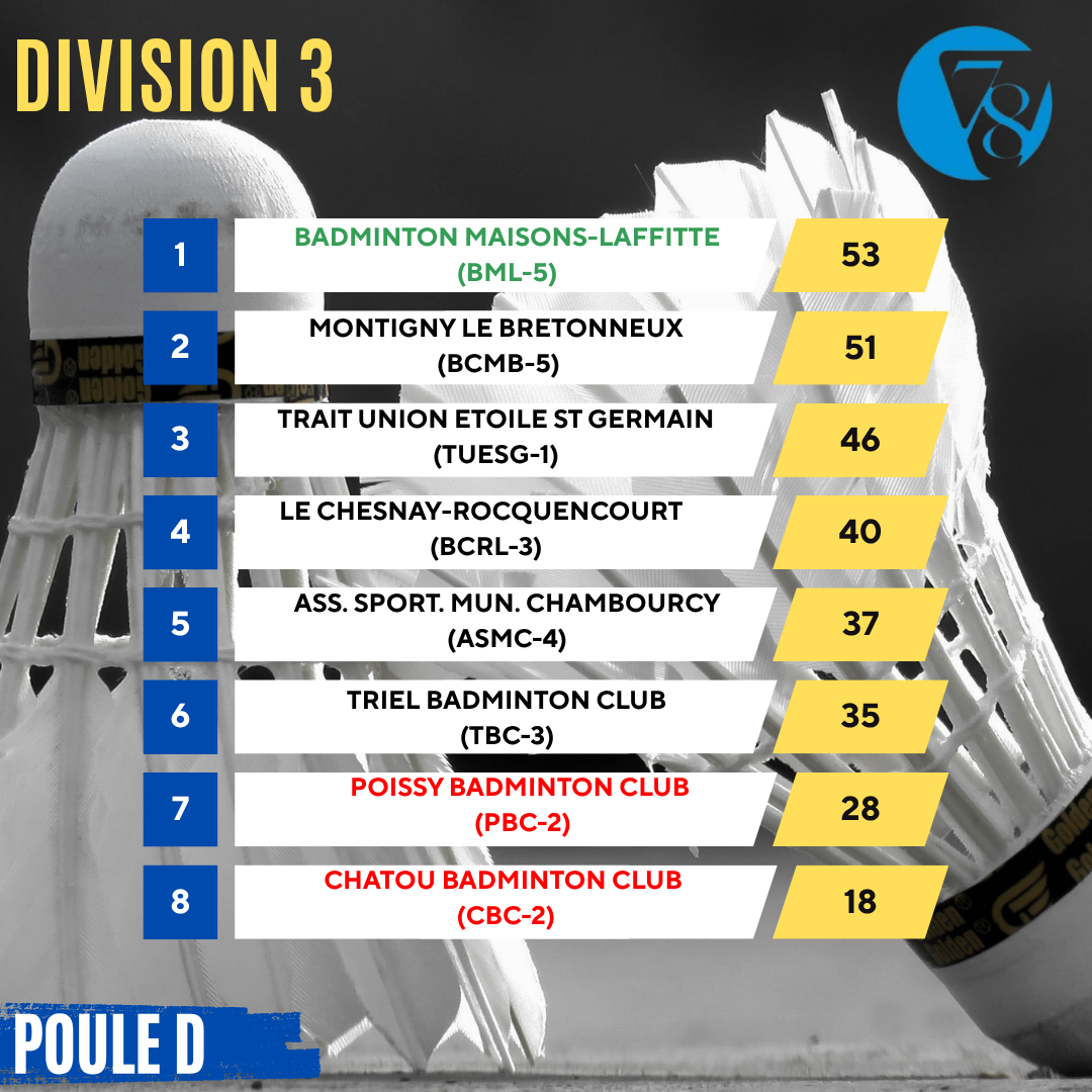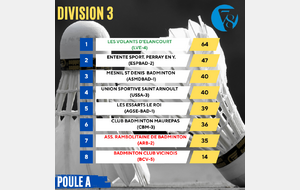 On poursuit aujourd’hui avec les résultats des interclubs départementaux mixtes, avec la Division 3 composée de 4 poules de 8 équipes.